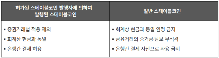 • 허가된 스테이블코인 발행자에 의하여 발행된 결제 스테이블코인과 일반 스테이블코인은 차별적으로 취급됩니다.