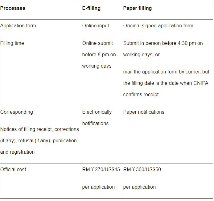 In addition, CNIPA offers applicants 10% discount of official fees if the application is filed via E-filling system. We set out the processes of the most popular use of applications for trademark registration i.e. E-filling Vs Paper filling as follows: