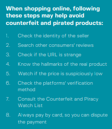 The Commission has prepared a "Counterfeit and Piracy Watch List", which lists examples of reported marketplaces and service providers whose operators or owners are allegedly resident outside the EU, and who reportedly engage in, facilitate or in other ways benefit from counterfeit sales. The aim of the list is to raise consumer awareness and encourage authorities to take the necessary actions to reduce the sale of IPR infringing products on these markets. Since the 2020 Watch List, several enforcement actions and measures have been taken, and e-commerce platforms are adopting developments, including protection portals, reporting tools and policies.