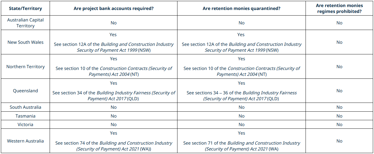 Each state/territory has different requirements as to project bank accounts and retention monies. No Australian state or territory prohibits the use of a retention monies regime as part of a construction contract.