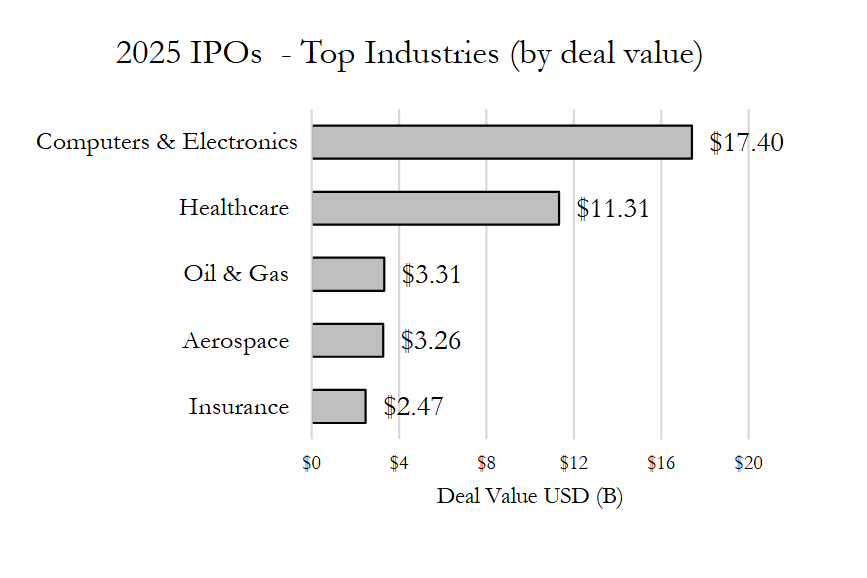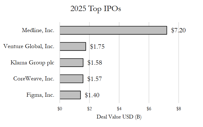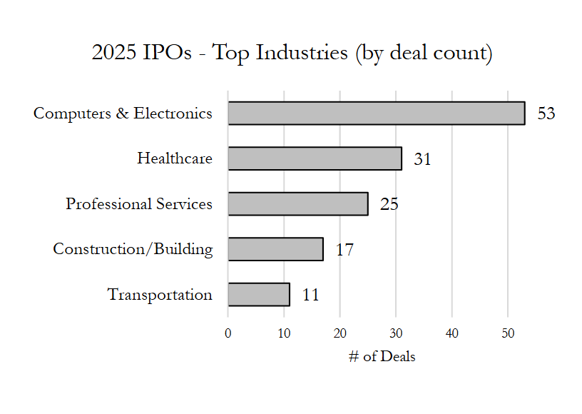 As with 2023 and 2024, technology and healthcare IPOs topped the charts in 2025, with technology leading with 53 IPOs raising a total of $17.4 billion followed by healthcare’s 31 IPOs totaling $11.3 billion proceeds. The largest IPO of the year—Medline’s $7.2 billion offering in December — accounted for 64% of the aggregate deal value for healthcare IPOs, while Klarna, CoreWeave and Figma (the third, fourth and fifth largest IPOs, respectively) collectively accounted for about a quarter of the aggregate deal value for technology IPOs. The professional services, construction and transportation industries also made a strong showing by volume, each with IPO counts in the double digits. The oil and gas, aerospace and insurance industries each priced several billion in IPO deal value, with Venture Global’s $1.75 billion IPO—2025’s second-largest IPO—placing the oil and gas industry in third place by deal value.