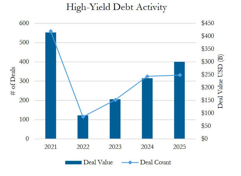 Like with other debt and equity markets, 2025 continued the growing momentum of high-yield debt offerings since 2022, albeit at a more measured pace than prior years, with just over $300 billion priced across 331 offerings. Up 27% by deal value from 2024, 2025’s growth decelerated from the 50% increase from 2023 to 2024 and even more from the 70% jump of 2022 to 2023. With only six more deals (+2%) than in 2024, deal count growth was also minimal in 2025. Despite the progress, high-yield debt in 2025 remained below 2021’s record high by 28% by value and 41% by count, though still ranking third by deal value in the last decade.