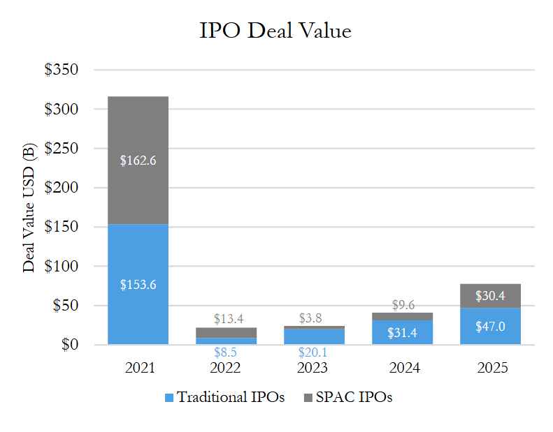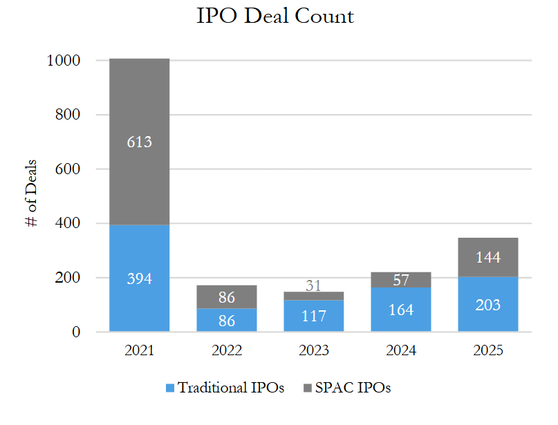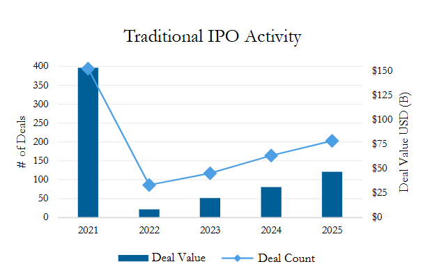 Traditional initial public offering (“IPO”) activity accelerated further in 2025, rising 50% by deal value and 24% by deal count from 2024 and continuing the streak of steadily increasing activity since 2022’s low. Just over 200 IPOs (about half of 2021’s record deal count) with nearly $50 billion in aggregate value priced in 2025, whereas 2024 saw 164 IPOs with $31.4 billion in deal value price. Overall, 2025 proved to be the strongest year since 2021, signaling a resurgence in new issues.