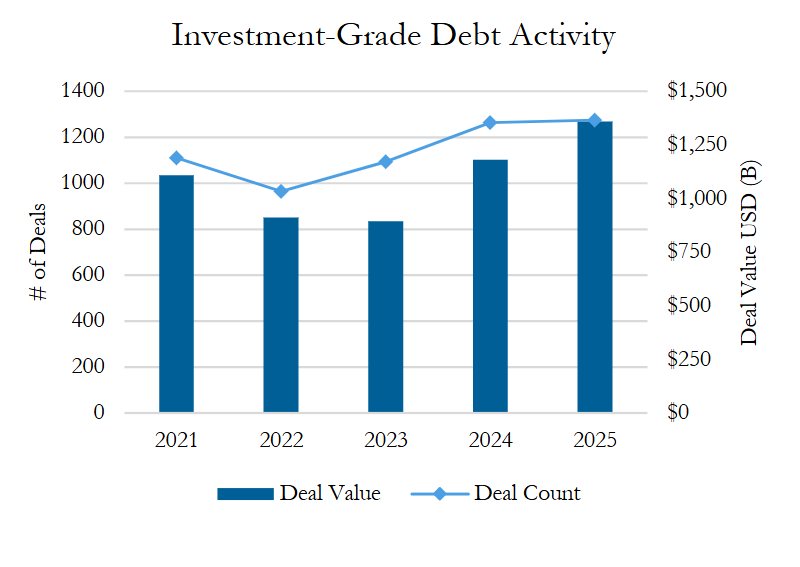 Investment-grade corporate bond activity1 continued to grow in 2025 with $1.36 trillion across 1,275 deals, largely surpassing the strong surge seen in 2024 from a deal value perspective (but only minimally in deal count). Deal value was up 15%, with deal count only up slightly (1%) from 2024. The continued growth in investment-grade corporate bond issuance indicates continued strong demand for high-quality debt.