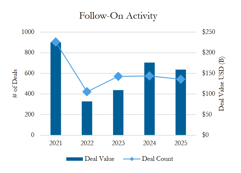 Follow-on activity dipped slightly in 2025, halting the upward trend since 2022. Compared to 2024, deal value was down 10% ($159 billion vs. $176 billion in 2024), while deal count was down 6% (543 vs. 575 offerings in 2024). Q1 2025 was especially low, with just over 100 offerings. Despite the decrease, follow-ons remained historically strong, up 94% by value and 29% by count from 2022’s record low.