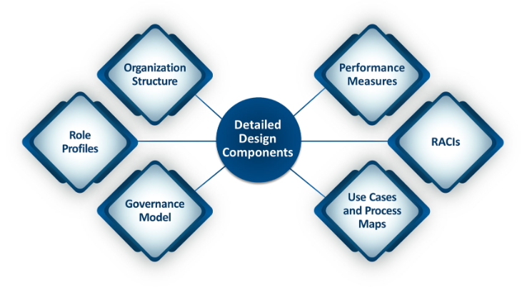 After design principles and the capability framework are defined, the next step is to build the complete operating model. There are six components of the detailed design: