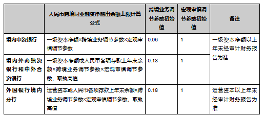 2018年1月,为进一步便利跨境贸易和投资,支持人民币跨境业务健康发展,改进商业银行跨境融资服务,央行对商业银行人民币跨境账户融资业务进行逆周期调节,即人民币跨境账户融资上限由商业银行人民币存款余额和逆周期系数决定,初始设定为3%。当外汇形势趋稳或人民币面临升值压力时,该系数可作为调节工具,引导跨境资金双向流动。