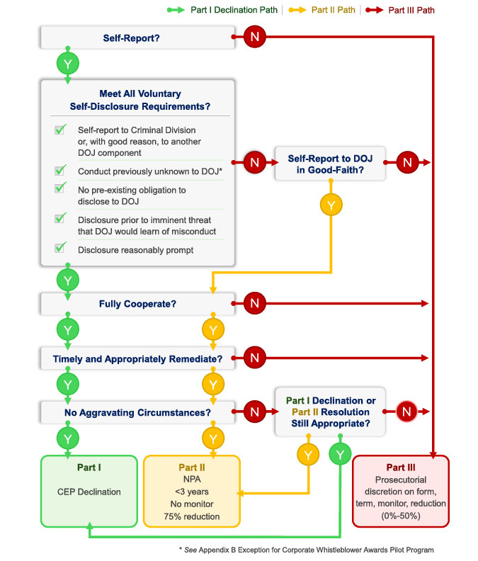 For the first time, the DOJ has included a visual decision tree (Appendix A) in its policy. This flowchart begins with a simple “Self-Report?” gate and branches into three distinct paths (Part I, II, or III), guiding companies through the declination process. The visual approach demystifies the steps and outcomes, making it easier for organizations to understand their options and obligations.