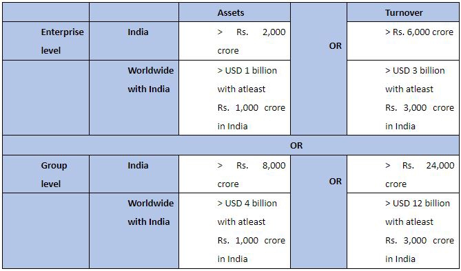 Currently, CCI’s prior approval for an acquisition or merger is required only if certain thresholds in terms of assets and turnover of the parties to an acquisition or the relevant group to which the target would belong, are met. The thresholds are given below: