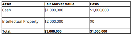 Often, the basis of intellectual property that appears on the balance sheet of a startup is self-developed intellectual property with a zero or near-zero basis, even though the fair market value of the intellectual property could be quite high. This discrepancy could push the value of assets above the 50% threshold of the passive asset test for PFIC, where it otherwise would not be, as depicted by the following simplified example: