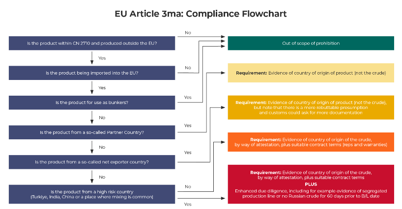 In order to comply with the prohibition, traders will need to identify the country of origin of the refined petroleum products, as different requirements will apply depending on the country of origin. These are summarised in the table below.