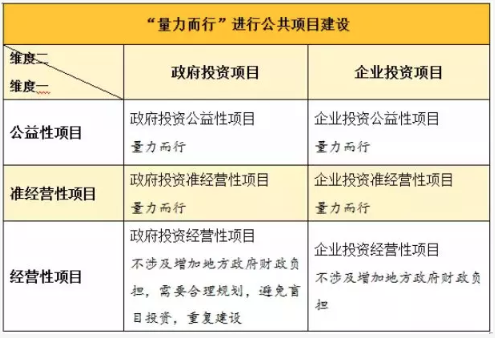 笔者认为,上述文件主要是为了防止增加地方政府的财政负担,防止地方政府过度支出。经营性项目系以经营收费覆盖投资成本,不涉及增加地方政府的财政负担,因此,上述文件中所称“量力而行”应该主要指的是在公益性项目和准经营性项目中需要量力而行。可以以下表表示: