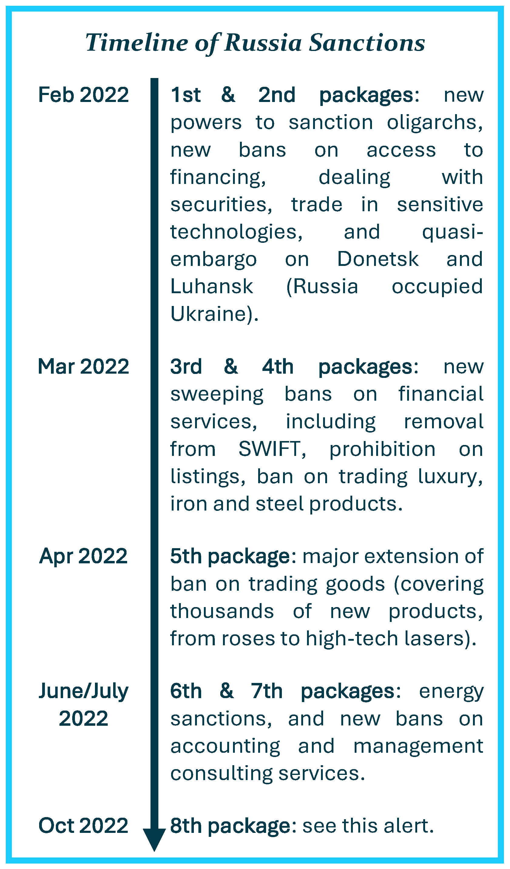 Thematically, the eighth sanctions package could therefore be understood as a commensurate geopolitical event: as Russia seeks to extend its reach over Ukraine, the EU extends its reach over any third party that Russia could use to support its extension. Although certain international corporates are currently afforded some shelter from this struggle, it is clear that the number of businesses affected by the conflict is growing.