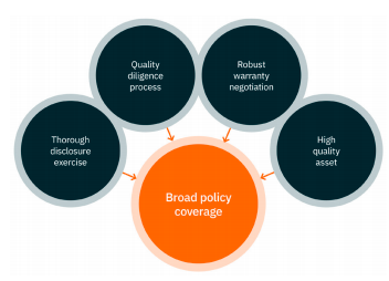 - Buyer's DD: Buyer's diligence (even if internally produced) is an obvious source of comfort for insurers. The customary areas of due diligence will be required to be conducted across legal, financial and tax and should correspond to the synthetic warranty package sought. Some insurers may insist on a specific scope of work to be satisfied. Certain insurers may be able to carry out their own due diligence on the deal on the basis of the information provided in the virtual data room. Scope of cover, warranties and pricing will all be dictated by this workstream. One key area to note is valuation: how the target has been valued is of utmost importance for insurers (e.g. liquidation value, book value, etc.).