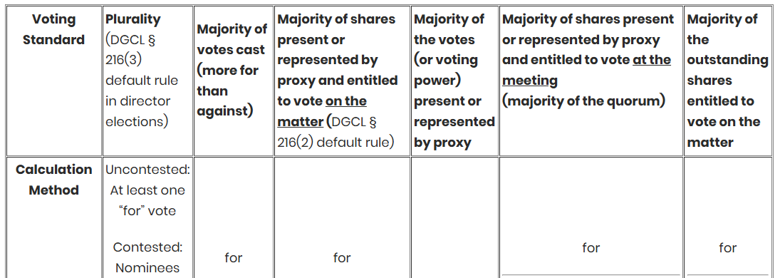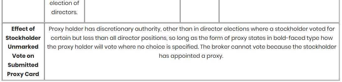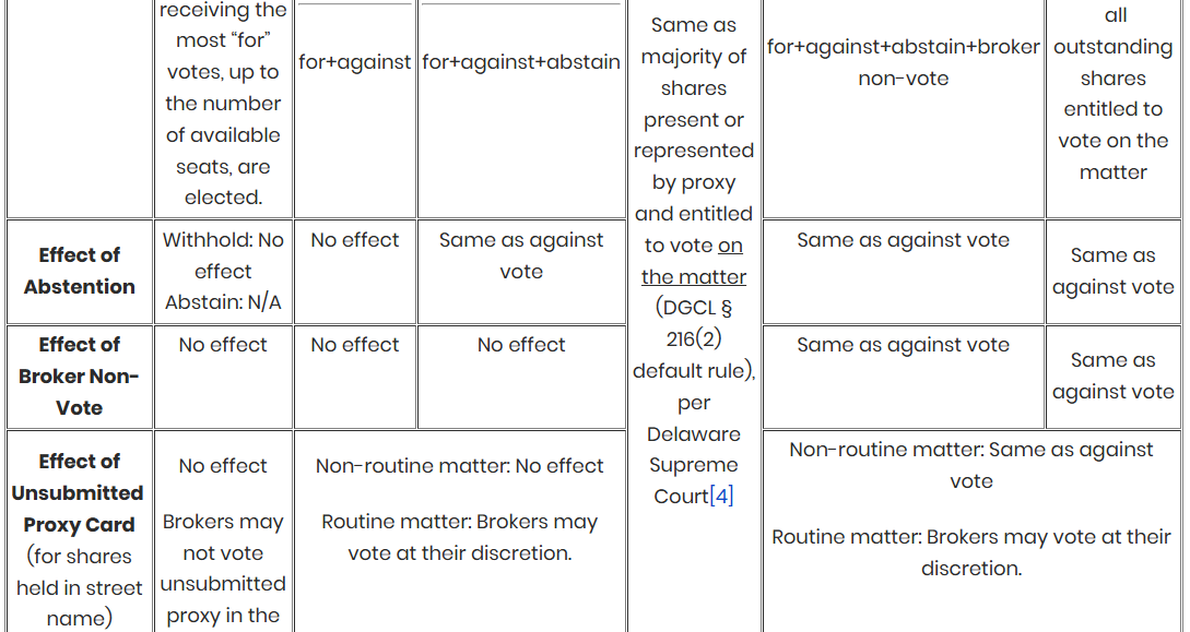 Annex A to this article contains a chart that shows the calculation method, the effect of abstentions, the effect of broker non-votes, the effect of unsubmitted proxy cards (i.e., failure to vote), and the effect of stockholder unmarked votes on submitted proxy cards, in each case under specified voting standards. These concepts are discussed in more detail below.