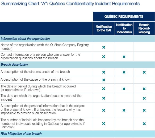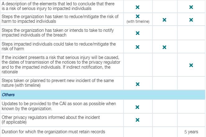 The requirements under the Confidentiality Incidents Regulation are similar to those under PIPEDA and Alberta’s PIPA. According to the regulations, notification to the CAI must be in writing and must contain the following information: