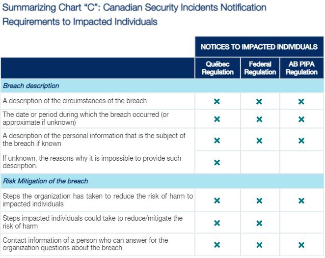 For the notification to impacted individuals, the Confidentiality Incidents Regulation provides that an organization must provide the following information: