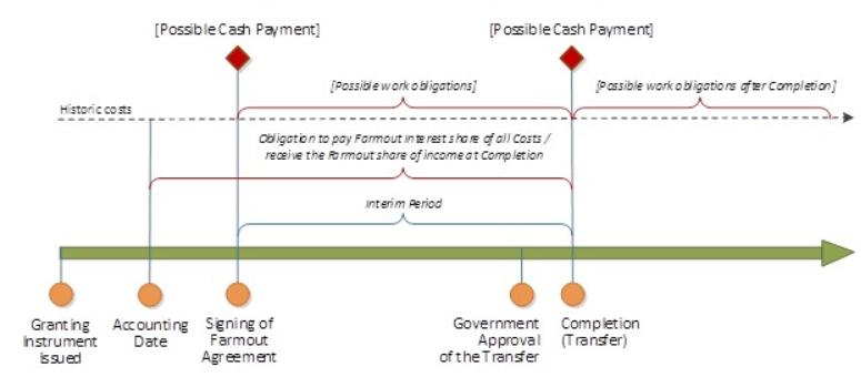 Given that a farmout arrangement envisages that the purchaser/farmee enters into a project that has already incurred costs for, at a minimum, acquisition of the Granting Instrument and the conduct of exploration operations, the valuation needs to address the parties’ agreement on the historic costs accrued by the seller/farmor to the date of the agreement to bring the two parties into parity, as well as the costs that will be incurred from the signing date of the farmout agreement until the actual Transfer.