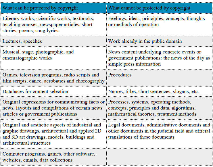 Copyright protects only the tangible expression of an idea, not the idea itself. Ideas and concepts are therefore not automatically protected by copyright. Below is a table of what can be protected by copyright in Vietnam, and what cannot be.