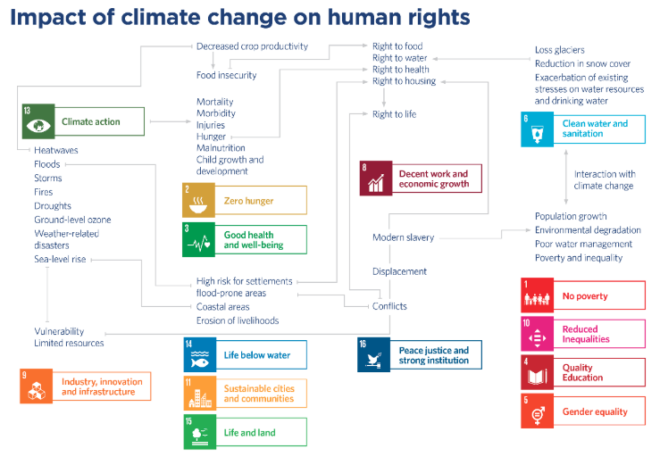 - Time-lag: there can often be an extended period between a climate change impacts of climate change, which are often future projections of today's human activity and the violation of human rights following that impact.