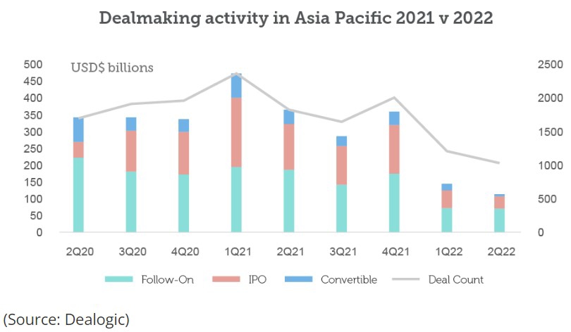 The US$115 billion worth of global equity capital market issuance in the second quarter of 2022 was the worst quarterly tally in more than a decade, according to Dealogic. Global IPO issuance fell 73% compared to the same period last year, with US deal value down 92%, Europe down 92% and the Asia-Pacific region down 80%.