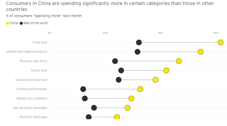 As you can see from the chart, consumers in China are far more likely to be in the segment we call “Hibernate and spend” and far less likely to be in “Cut deep.” This could be an encouraging sign for organizations that are looking to China as a lead indicator of how fast consumer sentiment will rebound. While the consumers who have lived in a coronavirus world the longest remain cautious, they are at least spending more again. What does this mean for the Chinese consumer’s spending habits? Overall, Chinese consumers are now spending more in a wider range of categories. But some categories are rebounding much faster than others.