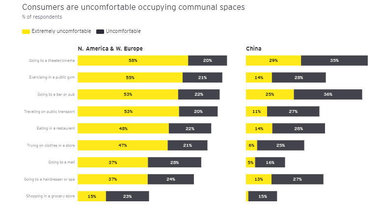 If you want to serve the Anxious Consumer, you must go the extra mile to help them feel safe. Perhaps it’s no surprise that, as the chart below shows, consumers in China are today less worried about returning to certain activities than consumers elsewhere. They have the longest experience of living with coronavirus and they came out of lockdown first.