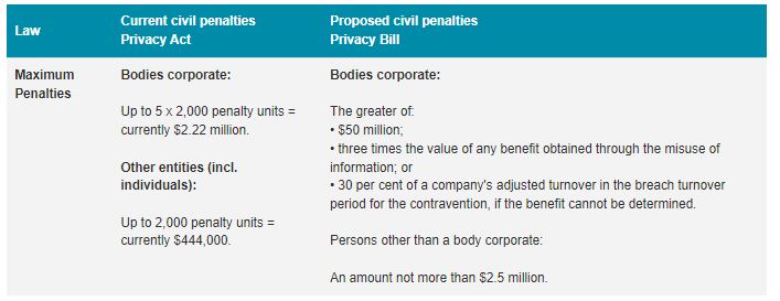 Below is an overview of current and proposed maximum penalties for serious and repeated interferences with privacy under each regime: