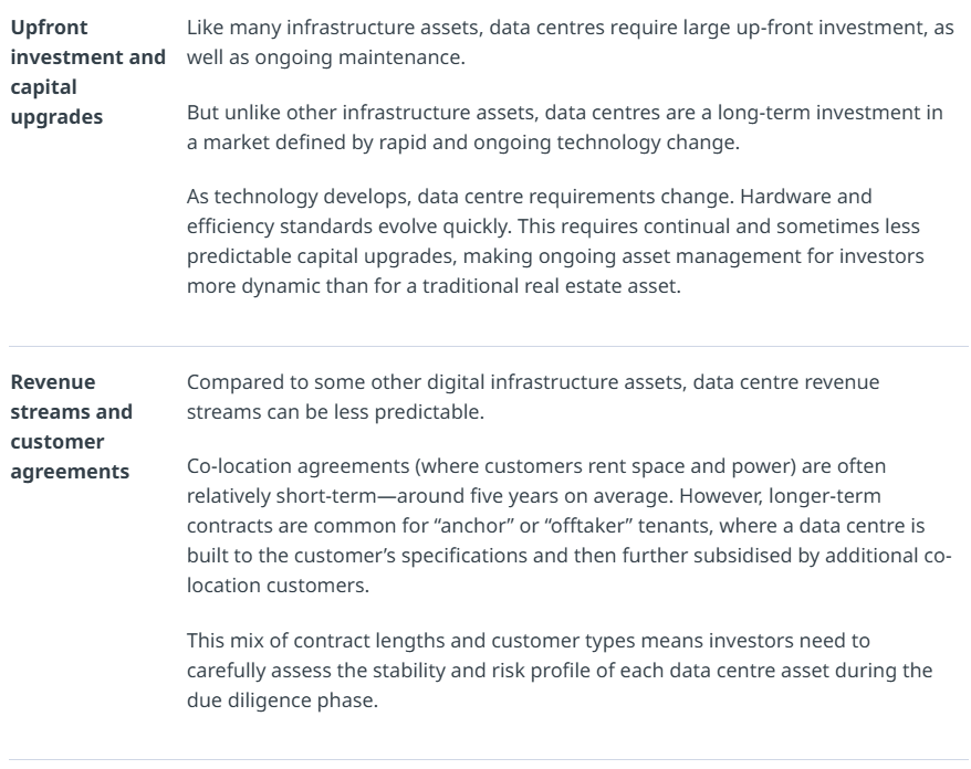 While record-low vacancy rates and expectations that new supply won't meet predicted demands provide investors with a degree of comfort, co-location agreements (the fastest growing demand sector for data centres) are generally for a maximum term of 5 years – they are not long-term stable sources of locked-in revenue.