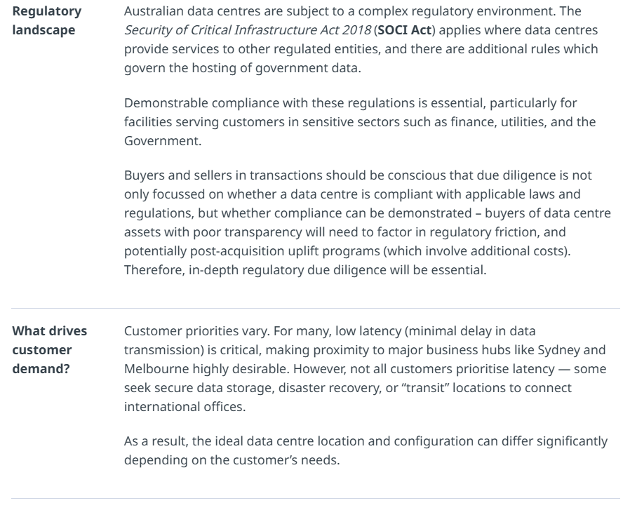 - M&A strategies need to factor in further transparency and scrutiny - Due to the elevation of data centres to a national interest, predicted supply shortages, expected industry consolidation, and reforms to Australia’s merger clearance and foreign investment review.