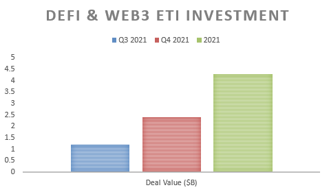 - According to PitchBook’s Emerging Tech Indicator report for Q4 2021, Defi and Web 3 had outperformed all other emerging tech sectors in both the volume and value of early and seed-stage deals. Focusing on Q4 of 2021, the volume (26) and value ($2.4 billion) of Web3 and DeFi transactions doubled compared to the same metrics in Q3 – illustrated below.