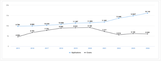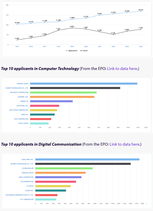 Computer Technology – Number of patent applications and grants (From the EPO: https://www.epo.org/en/about-us/statistics/statistics-centre#/technologyfields?code=6)