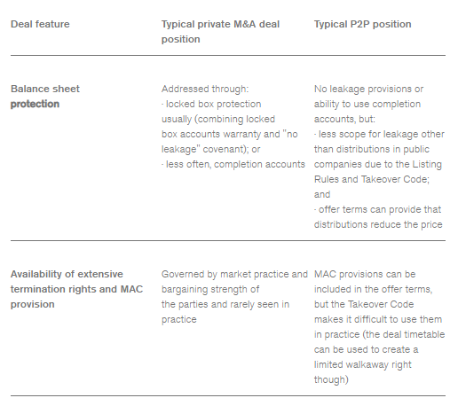 However, the core terms on which private M&A deals tend to get signed are not in fact that different to P2P transactions and once a sponsor is more familiar with the dynamics of a public M&A process, it can offer advantages over traditional auctions. To illustrate this, set out below is a high level summary of certain typical features of a private M&A deal and how they compare to a typical P2P transaction: