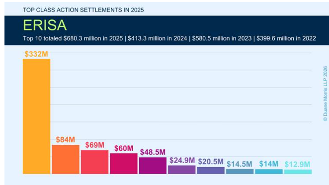 Jerry: Well, it’s certainly true that treatment of 401(k) forfeitures and the rise of ESG investing are reshaping the ERISA landscape. I see it every morning when we check the docket of the new class actions filed around the country. This is certainly a burgeoning area under ERISA. High certification numbers typically beget settlements. How did the plaintiffs’ bar do in terms of taking down major ERISA settlements in 2025?