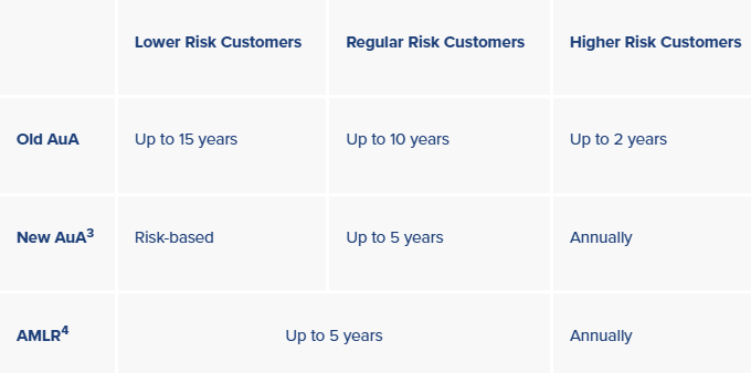 - BaFin has introduced new maximum periods for rolling review of KYC files pursuant to section 10 para. 1 lit. 5 GwG. These new requirements anticipate the update periods prescribed by Article 26 AMLR and must be implemented by the obliged entity until the AMLR comes into effect. While these periods are already standard practice for many international banks and financial service institutions, for others, updating all KYC files to the same review cycle until the time the AMLR comes into effect may be a tedious and lengthy process: