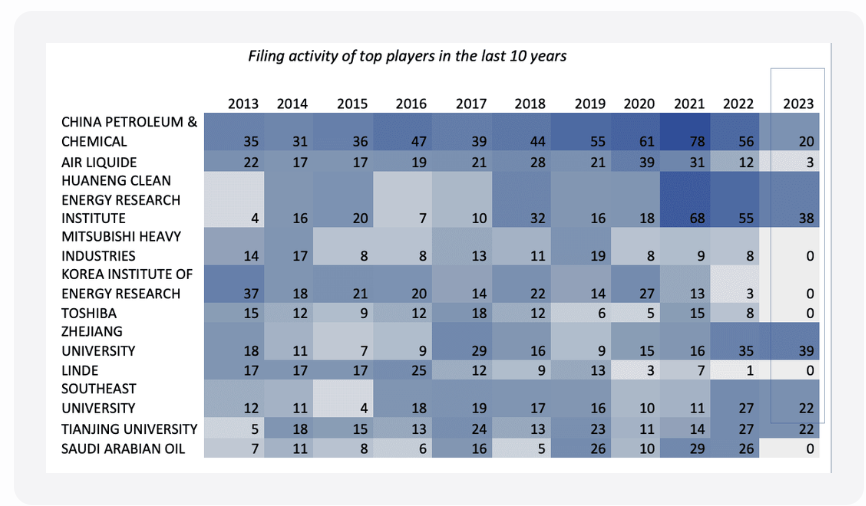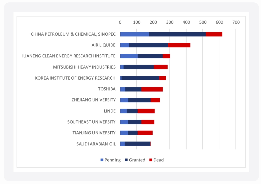 - SINOPEC, an oil and gas company, is leading the top players, with 600 patent families of which 83% are alive and 342 are granted. Most patent families are protected in China with few being extended. This reflects the commitment toward the carbon emission reduction adopted by the company. Its green and low carbon efforts have been rewarded with the title of ‘China Low-Carbon Model’. One of its projects, the Qilu-Shengli Oilfield million-tonne carbon capture, utilization and storage (CCUS) demonstration project was completed and put into operation in August. SINOPEC has had a steady filing over the past decade with a peak in 2021 (78 patent families).