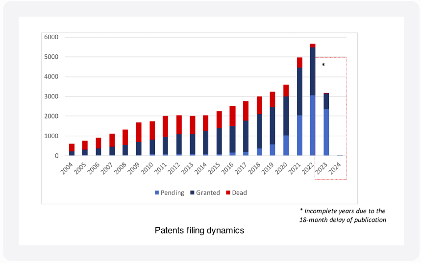 Over the past decade, most patent families have either been granted or are currently pending, compared to dead ones. This trend signals a surge in development efforts, largely propelled by market demand for solutions and technologies aimed at reducing carbon emissions. In addition, it underscores the growing recognition of the potential value derived from the creation of other products using the captured CO2 in various fields.