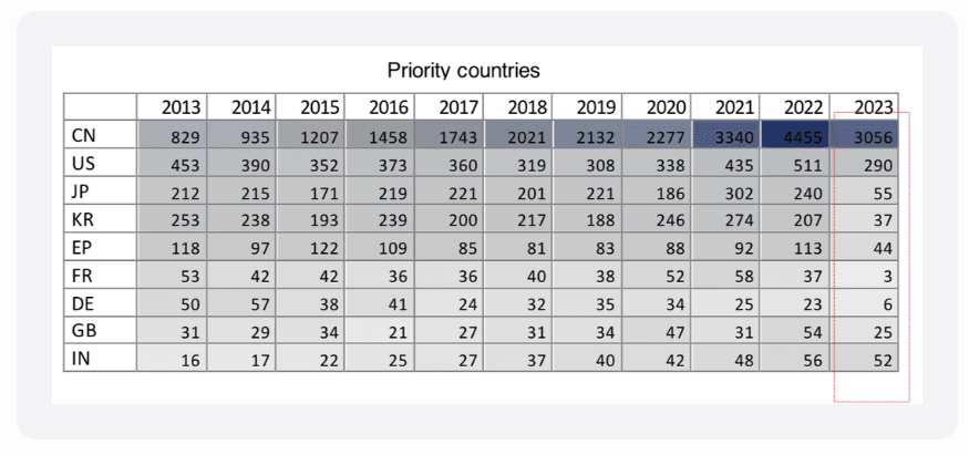 Analyzing priority countries in patent filings reveals the most innovative nations currently active in the research and development (R&D) of carbon capture technologies. Asia is the most contributing continent with four countries, China, Japan, Korea, and India. China is the leading country with the highest number of patent filings over the past decade. This could be interpreted as China, being the world's largest emitter of CO2, facing heightened pressure to reduce its carbon footprint. Consequently, there is an increased incentive for R&D to meet government targets for CO2 emission reduction, particularly through the advancement of carbon capture technology. The U.S. is also actively working on this technology, with second position among the top 10 filing countries with a constant filing trend since 2013, followed by Japan and Korea. European countries appear among the leading countries in this domain with fewer patent families in the same time range.