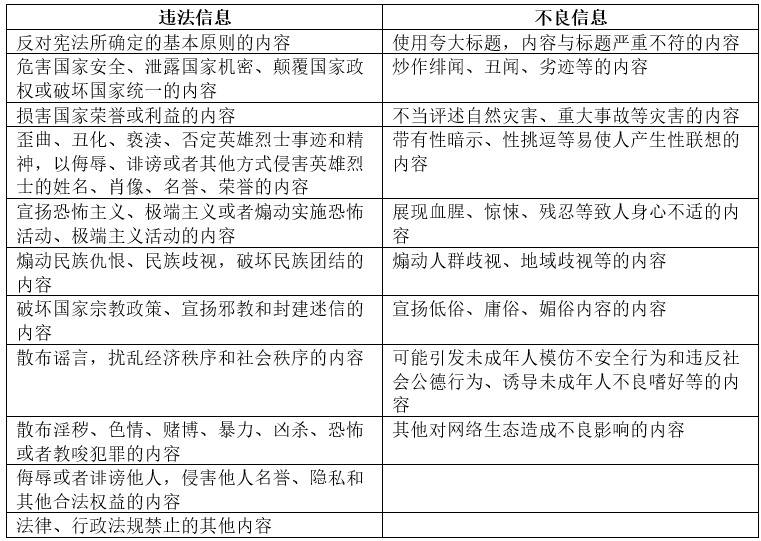 - 非法和不健康信息:这是《内容规定》中列举11类非法信息和9类不良信息的统称: