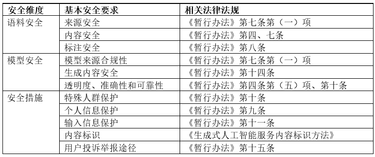 《基本要求草案》就生成式人工智能服务面临的语料安全、模型安全、安全措施、安全评估、备案申请等安全问题提供了基本的指引。对此,我们结合中国现有的人工智能治理法律框架、相关领域的司法实践以及我们实务中的经验,在后文中详细探讨这些要求。