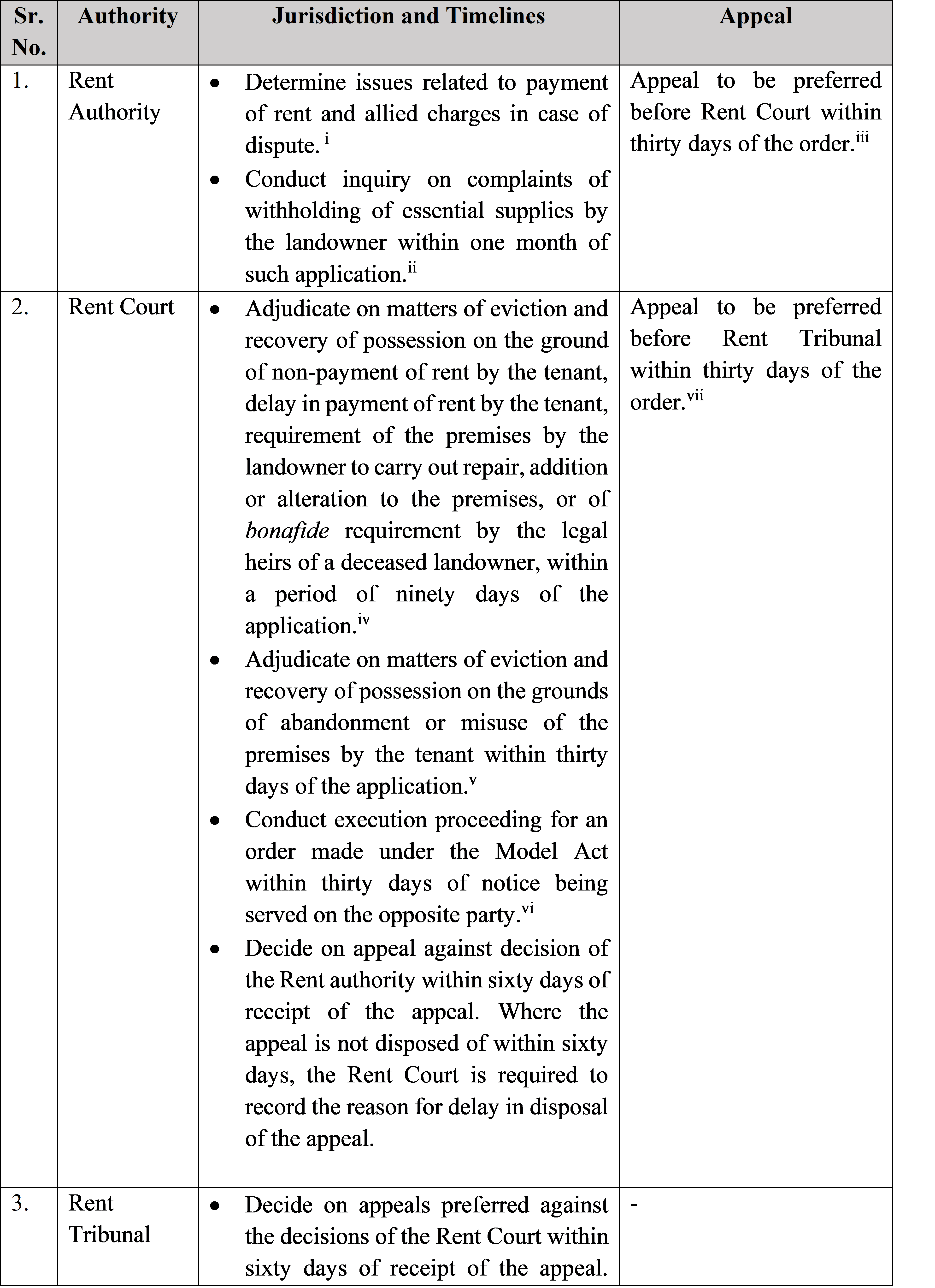 An overview of the role to be played by the authorities/courts to be constituted under the Model Act is as tabulated below: