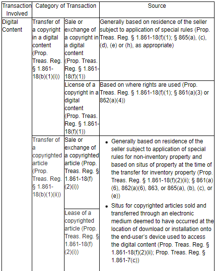 Special Source Rule for Electronic Transfers of Copyrighted Articles. The Proposed Regulations also deem the sale or lease of copyrighted articles to have occurred at the location of download or installation onto the end-user’s device used to access the digital content for purposes of the passage-of-title rule. The effect of this special rule is to source income from such transactions at the location of download or installation where the passage-of-title rule applies. Where information about the actual location of download or installation is absent, taxpayers may use recorded sales data for business or financial reporting purposes as a proxy.