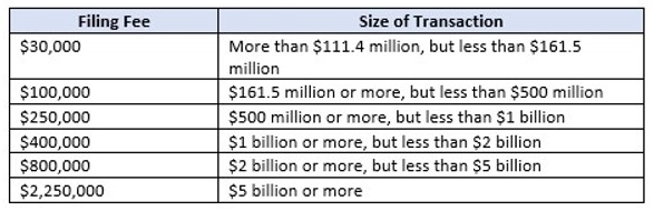 On December 29, 2022, the President signed into law H.R. 2617, the Consolidated Appropriations Act, 2023, which included the Merger Filing Fee Modernization Act. This Act required the FTC to revise the filing fee thresholds annually. In 2022, HSR filing fees were $45,000 for transactions valued in excess of $101 million but less than $202 million; $125,000 for transactions valued at $202 million or more but less than $1.0098 billion; and $280,000 for transactions valued at $1.0098 billion or more. For all filings made on or after February 27, 2023, the new HSR filing fees are as follows: