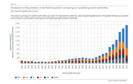 In January 2023, the European Patent Office (EPO) published a comprehensive report providing an insightful analysis of patent developments & trends in the field of quantum computing. The report shows that the number of patent applications related to quantum computing has skyrocketed in recent years all around the world. The graph below shows the rising number of patent families in the field of quantum computing over the last two decades with an an above-average share of international patent applications, suggesting high economic expectations in the technology and a multinational commercialisation strategy by the applicants.