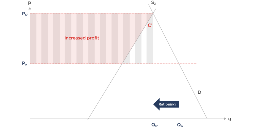 As a result, the price that the government pays for energy will be even higher than market prices in the absence of intervention, as is illustrated in Figure 4. At the capped price of PA, consumers wish to consume QA units of energy – the same as they were consuming before the supply shock. But higher prices are required to bring forward this amount of energy. The market price rises to PC, which is the corresponding price for QA on the new supply curve S2. Energy providers thus receive even higher profits, and the government pays the difference between PA and PC (grey shaded area).