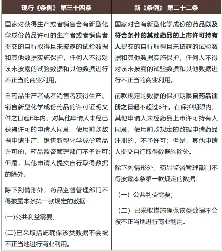新《条例》第二十二条延续了现行《条例》中对于创新药品的数据保护制度,该制度的核心在于,对药品上市许可持有人自行取得且尚未公开的试验数据及其他相关数据给予法律保护,从而鼓励创新。试验数据保护制度是对专利保护体系的重要补充,二者结合将进一步促进创新企业的研发与投入。新《条例》在延续并完善试验数据保护制度的同时扩展了其适用范围,相关的新旧法规对比如下: