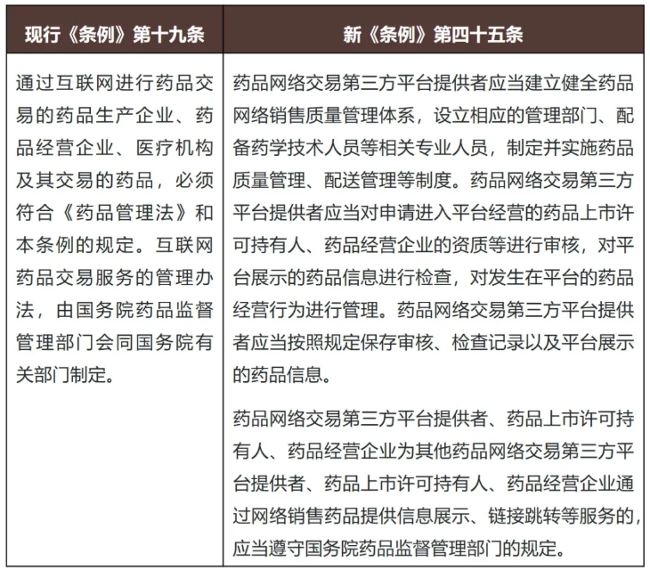 1. 明确网络销售第三方平台责任现行《条例》第十九条仅规定了通过互联网进行药品交易的主体(药品生产企业、药品经营企业、医疗机构)的相关责任,未明确相关网络平台的责任;而新《条例》着重强调了网络交易平台的管理责任,要求药品网络交易第三方平台提供者建立健全药品网络销售质量管理体系,做好入驻审核、检查监控等工作,相关新旧法规对比如下: