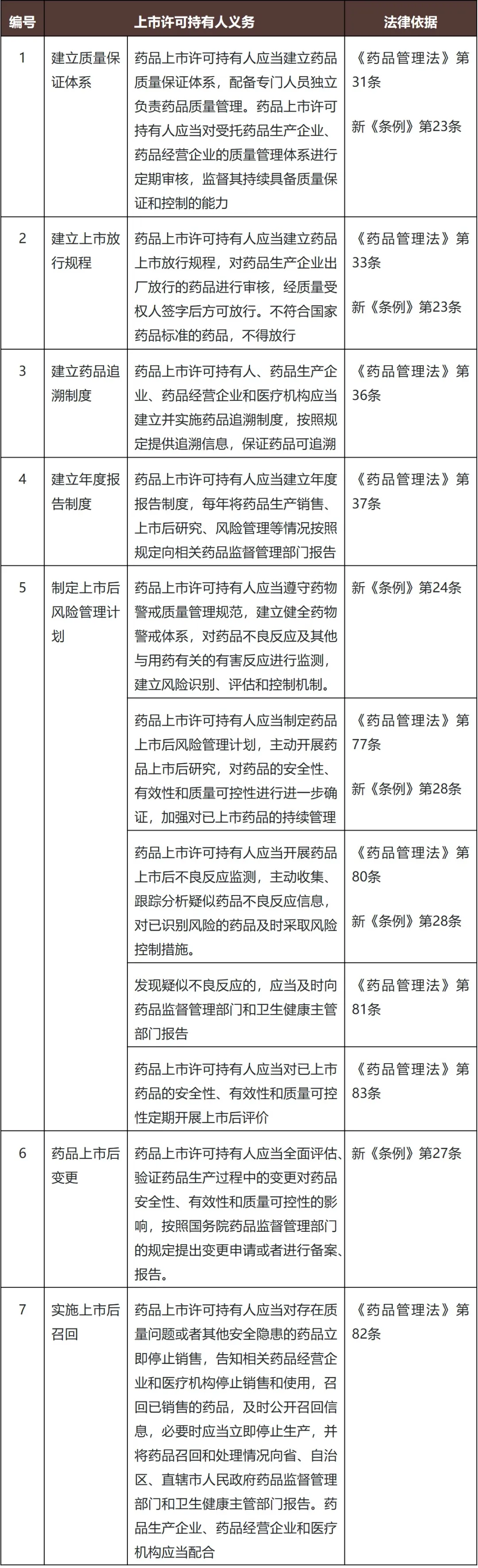 二、对上市许可持有人新《条例》第三章“药品上市许可持有人”(第二十三条至第二十九条)对上市许可持有人全周期的义务与责任作出了系统性的规范,本部分内容也是新《条例》将监管重心从"管生产、销售企业"转向"管品种、管全链条"的重要体现,呼应了2019年《药品管理法》的修订,通过细化上市许可持有人的责任,落实其作为药品安全第一责任人的法律地位。