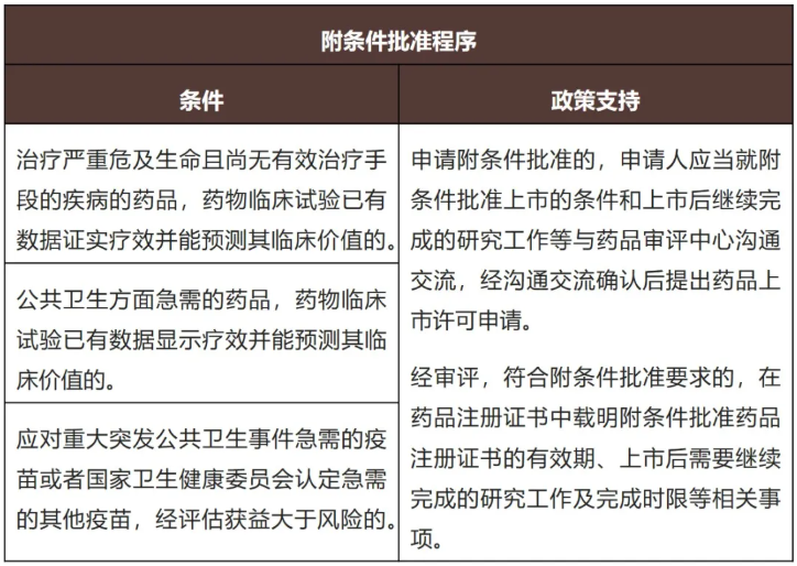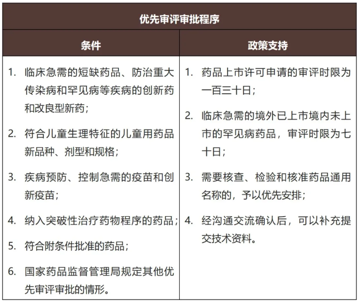 对于新《条例》中所提到“符合条件的药品注册申请”所指代的具体要求,还需进一步参考《药品注册管理办法》中的有关规定。值得注意的是,在纳入快速审评程序后,如果发现拟上市的药物不再符合纳入条件的应当终止该品种优先审评审批程序,按照正常审评程序审评。结合《药品注册管理办法》,我们将新《条例》第十五条中提到的各个快速审评程序的有关纳入条件及政策支持总结如下: