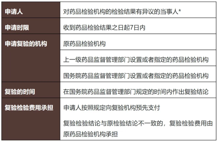 *注:国家药品标准规定不予复验的检验项目,或者有国务院药品监督管理部门规定的其他不予复验的情形的,不予复验。